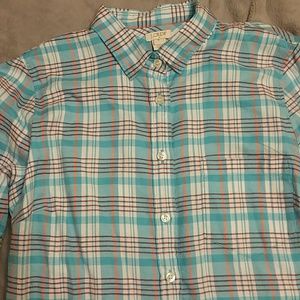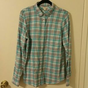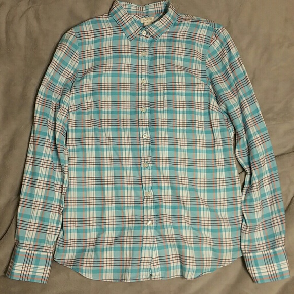 Jcrew Factory flannel plaid button down shirt in blue, red, orange pattern. Size M. 100% cotton. Has one front pocket. Comfortable, light weight and warm!