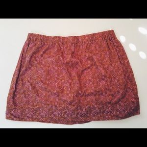 Cotton linen blend mini skirt in a pink and orange floral pattern. Great, easy weekend skirt with and elastic waist band.