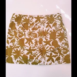 Woven cotton mini skirt in a fun olive brown pattern. Falls above the knee. Side zip