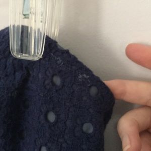 Strapless, navy, eyelet dress (with pockets!) supportive fit. Great condition, two minor stains pictured (may come out with dry cleaning- have not tried) Beautiful summer dress!