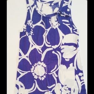 Purple and white flower patterned sweater sleeveless shift dress. Light cotton. Bow detail on neckline. Falls at knee.