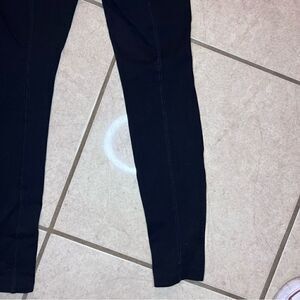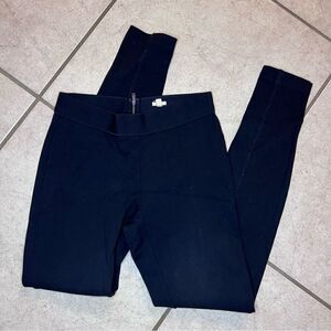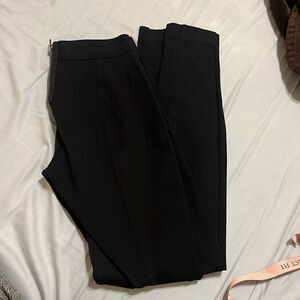 Back zipper, seam that runs along entire back leg, low waist, skinny pant, flattering fit.