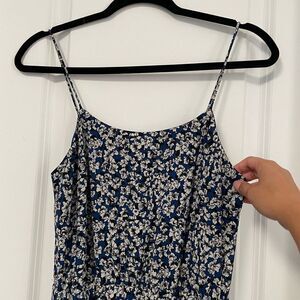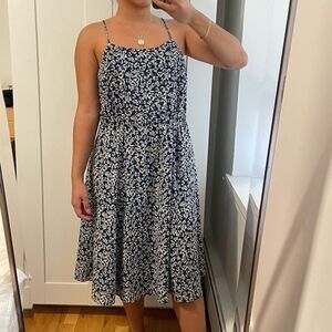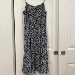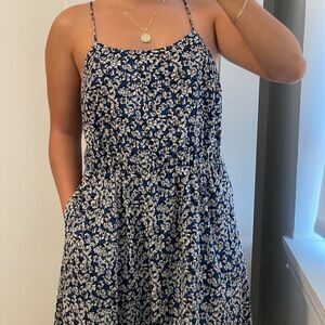 Description: gorgeous cami strap floral dress with pockets, elastic waist, fully lined, white flower print on dark blink dress, 31 inches long