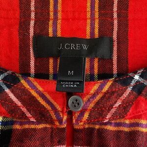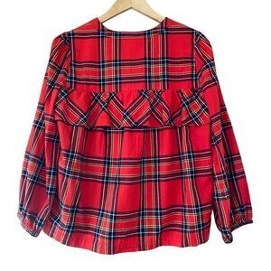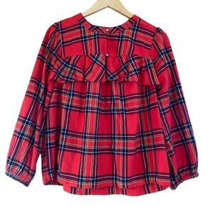 J.crew plaid flannel ruffle long sleeve pop over blouse | top. Size medium. Bright red flannel top has super cute ruffle detail that runs across the front and back at chest. Double button at front neckline and elastic at the cuffs/sleeves. Comfy, classic, cute and cozy! Great preowned condition!