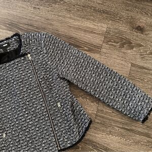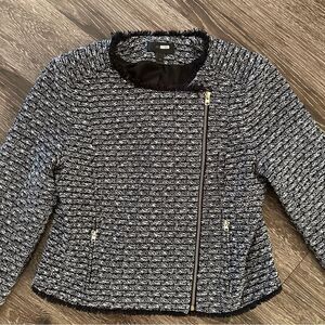 Gently worn in excellent condition black and white tweed jacket with asymmetric hem and fringe detailing