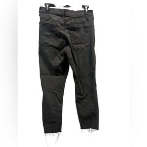 In great cond, button fly closure front and backlog pockets, distressed hem, inseam 26 inches, leg measures 8 inches he’s across . Color is a faded black gray color . Waist is 28 inches