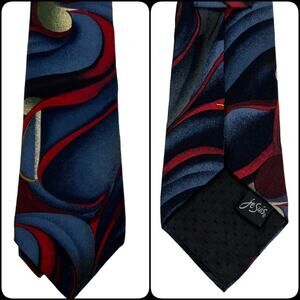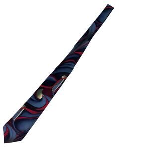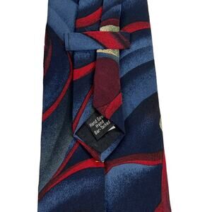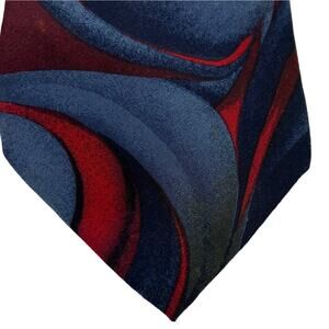 Beautiful men's necktie in blue, red and gold swirled pattern from Je Suis Hand sewn and hand bar-tacked. 100% Silk. Due to light & screen variations, colors may vary slightly from the images