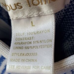 Stylish maxi dress with a blue geometric patterned top and flowing white skirt. Perfect for summer outings.