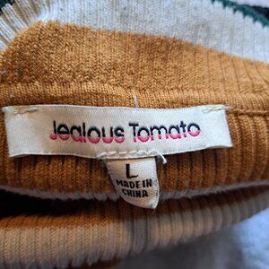 Excellent condition dress from Jealous Tomato - perfect for fall! Tannish-orange, green, white and black stripes, turtleneck and long, ruffle sleeves. Ribbed knit fabric is super stretchy. Size large; measures about 12 inches between the pits, 37 inches long and 21 inch sleeves.