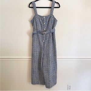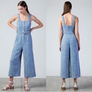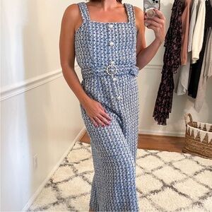 Jealous Tomato Paulette Tweed Cropped Jumpsuit in Blue Tweed. NEW with Tags! Women's Size Large. Mock pearl button front, straight neckline, cami straps, adjustable waist belt with pearl details, concealed back zip, wide leg, fully lined, very soft and comfortable. . Great pre-owned condition, missing single pear on belt ring that is not that noticeable. New with tags.