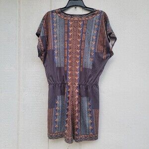 The multicolor tribal print and faux suede texture give it a unique and stylish look . With short sleeves and a V-neckline, it is comfortable and perfect for travel, party/casual wear. It is machine washable and made of 100% polyester. This one-piece romper comes in size small and has a snap button closure.
