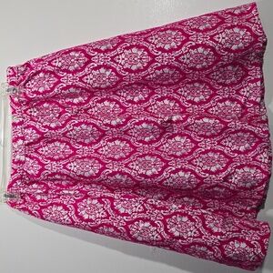 Vibrant pink A-line skirt with intricate white pattern. Perfect for any occasion.