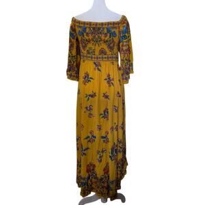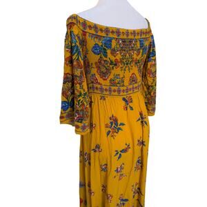 In great condition. Features short bell sleeves, a smocked bust, and an open front hi low hem. Please note the modeled photos are of a different dress, but should give you a good idea as to the fit.