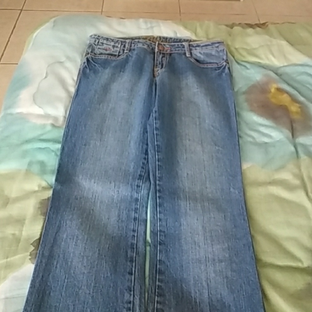 Medium blue great fit. nice leather package in the back. In perfect condition. The size is 32..