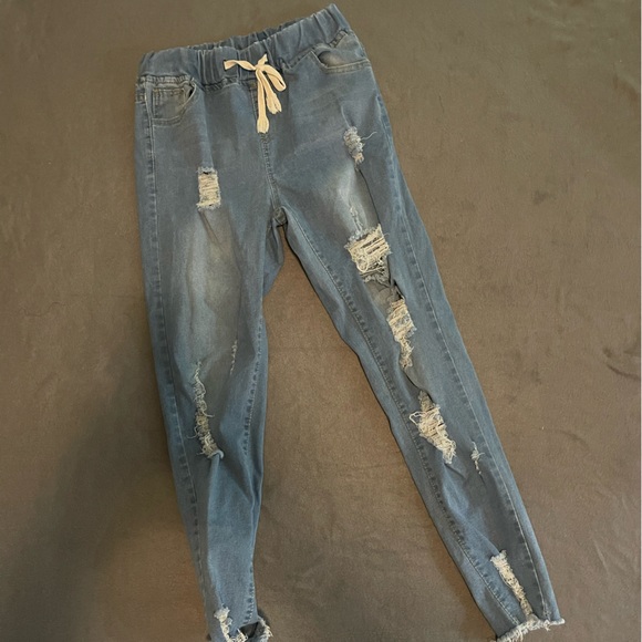 Trendy skinny distressed skinny Jean. Elastic waist with drawstring. Super cute!