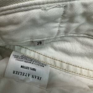 Jean Atelier Foldover High Waist Distressed Cream Denim Jeans. Basic five pocket styling. Button fly. Intentional distressing. Cream/white color 100% cotton. Made in USA. Womens size 28. Good used condition.
