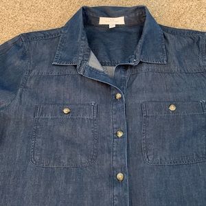 Very nice and pretty button-down in fabulous condition! From pet and smoke free home. Shirt length in front is 19&1/2 inches, shirt length in back is 26&1/2 inches long, bust measurement is 21&1/2 inches across, and sleeve length is 21&1/2 inches.