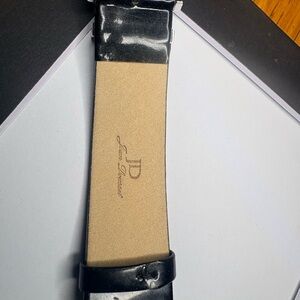 Elegant watch featuring a black leather strap and a sparkling crystal bezel. The dial has a mother-of-pearl finish. Never worn plastic still on back , face and crown.