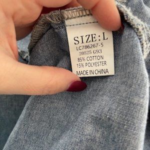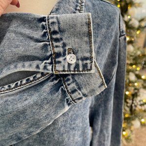 Jean dress with layered detailing on the back and button closure. There are buttons on the sleeves for closures around the wrist. Never worn