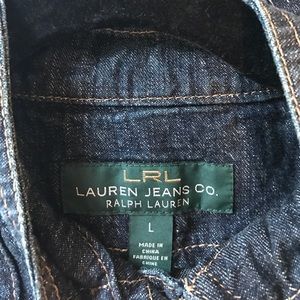 Lauren Jeans Co. Ralph Lauren Jean Jacket. Dark denim, 3/4 length sleeves, and buttons down the front. Two miniature pockets in the front. Perfect spring coat!