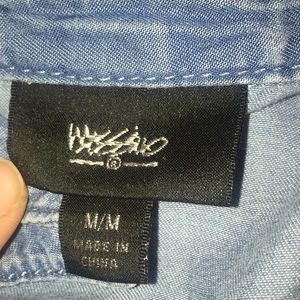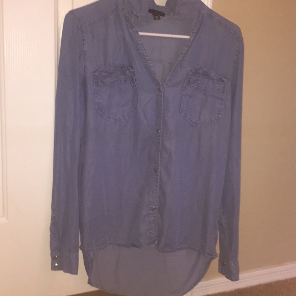Nice Jean jacket. Longer in the back so its cute to pair with leggings or to tie around your waist. Buttons up with those little metal clasp things idk😂 I have no idea what brand it is😂🤷🏻♀️