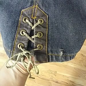 Back has a tie up are at the bottom with leather type strings. Has a small knit at the bottom beside one of the Ties. See Photo