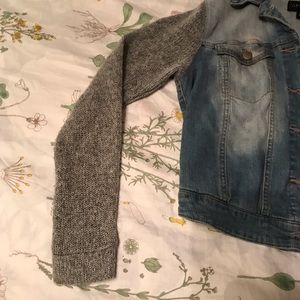 Jean jacket with sweater sleeves. size small. super comfy and fashionable!