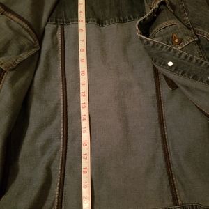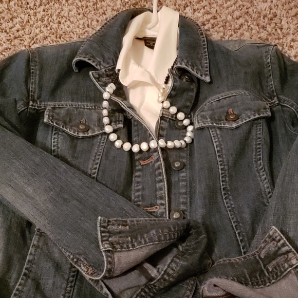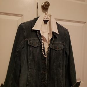 Absolutely gorgeous jean jacket. Looks fabulous with black dressy pants and white shirt. White shirt and pearl necklace depicted in the photo are not for sale. Size 10. All buttons state Coldwater Creek. Great condition.