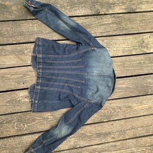 Dark wash jean jacket size 4. Has some stretch, super comfortable. For reference, I wear US size 2-4 and am 5’10”