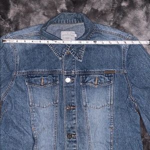 Calvin Klein denim jacket. Shoulder to shoulder approximately 18 inches. Length approximately 21 inches. Im great condition, no signs of wear.