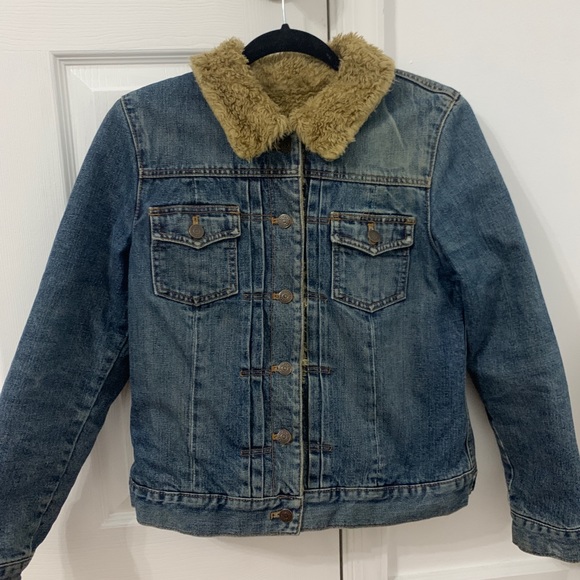 Sherpa lined, medium washed Jean jacket! Size small but fits like an extra small!