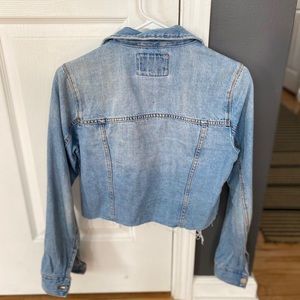 Cropped jean jacket with frills on the bottom.