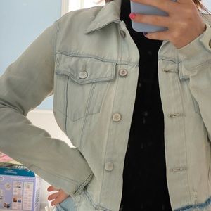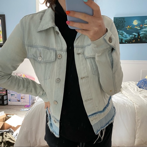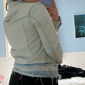 Cute denim jacket with some intentional fraying and rips on the back! A bit small on me!! Brand is J Brand!