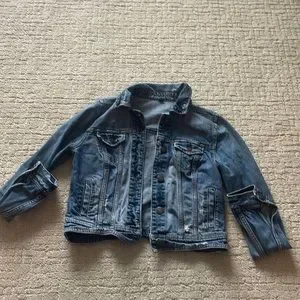 This Jean jacket has been a staple in my closet but recently became too small. It fits great and the distressed look has been apart of the original look. All buttons work