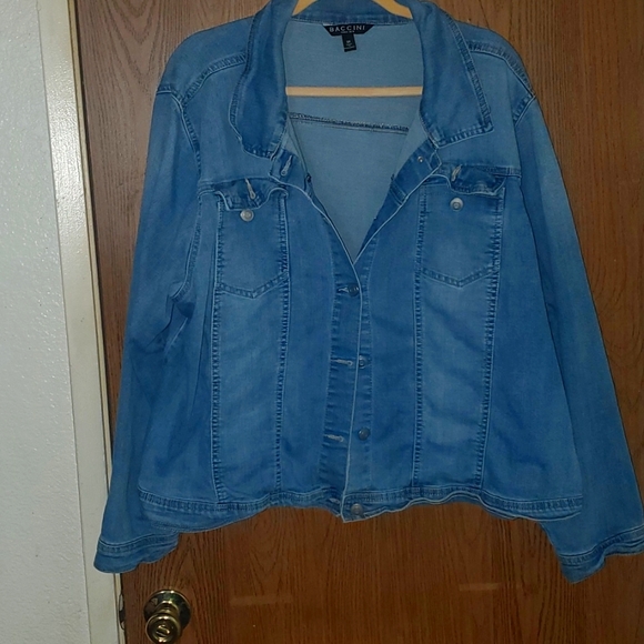 Really cute super stretchy Jean jacket. 66 percent cotton, 30 percent polyester 3 per cent on one percent spandex made in bangle dash. But not silver 2 pockets. Buttons on wrists closet staple