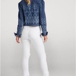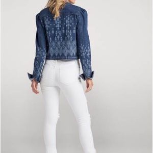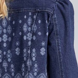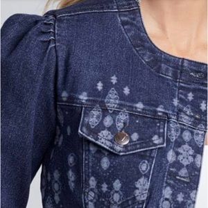 new in bag. Denim jean jacket with embellished paisley type design. Cropped fit and puff shoulders with chest pockets and silver buttons. SUPeR CuTE