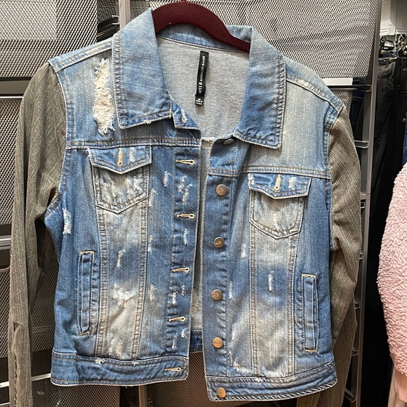 Black and blue ripped Jean Jacket in very good condition size M but can also fit Small.