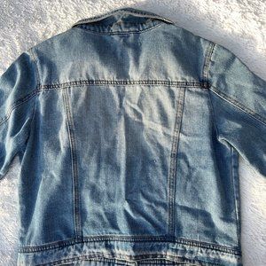 This soft denim jacket is classic and comfortable. It is a size medium and is loosely fitted in a classic medium wash.