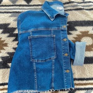 An adorable jean jacket! Pretty detailing. Size 3x but fits like a large. Dark blue denim. Smoke free home. Only worn a few time, like new!