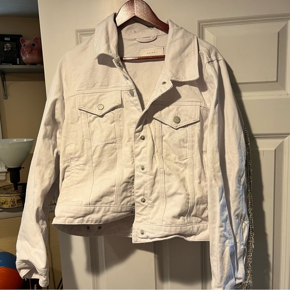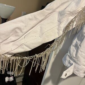 Very cute jean jacket with tassels. Tassels on one arm are falling off from washing/ drying it but can be sewn back. Only wore once.
