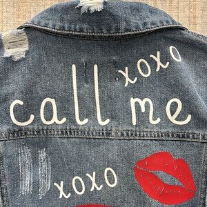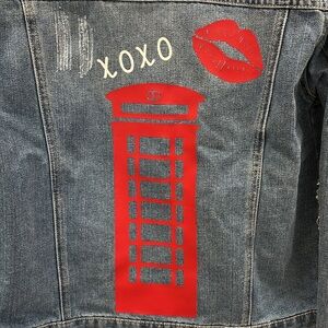 Custom jean jacket. Features a telephone booth on the back with the words call me and xoxo with lips. Size large. Button up front. Distressed jacket.