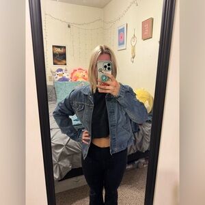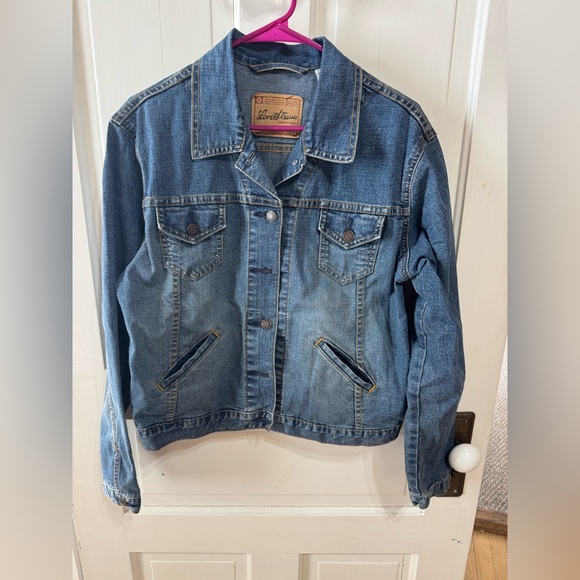 Jean button up jacket. Levi Strauss size medium. Four pockets on front, buttons on sleeve cuffs, adjust side buttons.
