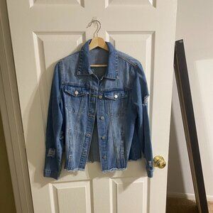 Women's denim jacket comes with lapel collared neckline, button up closure design, single-breasted buttons, two front flap pockets, fashion ripped holes, trendy worn denim and fringed hem
