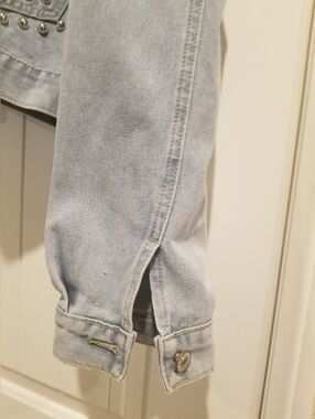 Jean Jacket trimmed with silver studs. Material: 85% Cotton and 15% Polyester. Brand unknown. Excellent condition.