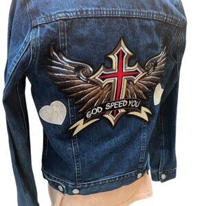 "God speed "Custom Upcycled Jean by C.Rainwater Crow line/ Size small Shoulder to shoulder 15" length is 22" arm length is 24".