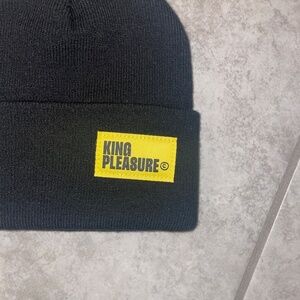 Black acrylic beanie. Yellow King Pleasure logo stitched on the front. Foldable for more or less space.