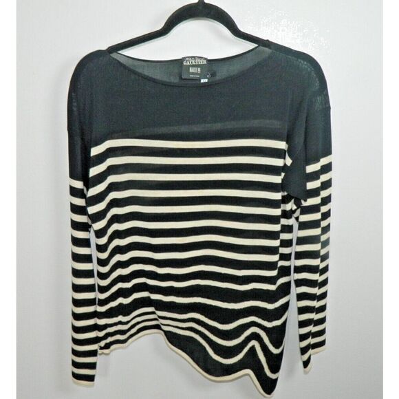 Rare Vintage Jean Paul GAULTIER Sweater Medium Blue and White Striped 100% Cotton Knit Asymmetric Wave Hem