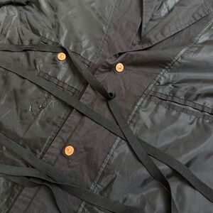 Insane item . Bondage trench, very very old . from the early 2000's . The strings can be tied around you for a cool bondage look . button or unbuttoned, both are nice . a lot of details and pockets . engraving on the buttons . I like the ribbed cotton sleeves . lovely item . Men's item but I put it on a girlfriend of mine as a model