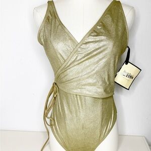 Elegant gold wrap swimsuit. Features a stylish tie detail.