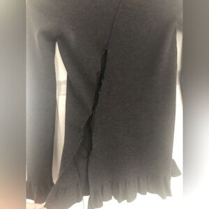 Jean Paul Gaultier Grey Wool Turtleneck Knit Sweater with sexy opening design in front. Ruffled sleeves and bottom of sweater add the perfect accent to this fitted top.